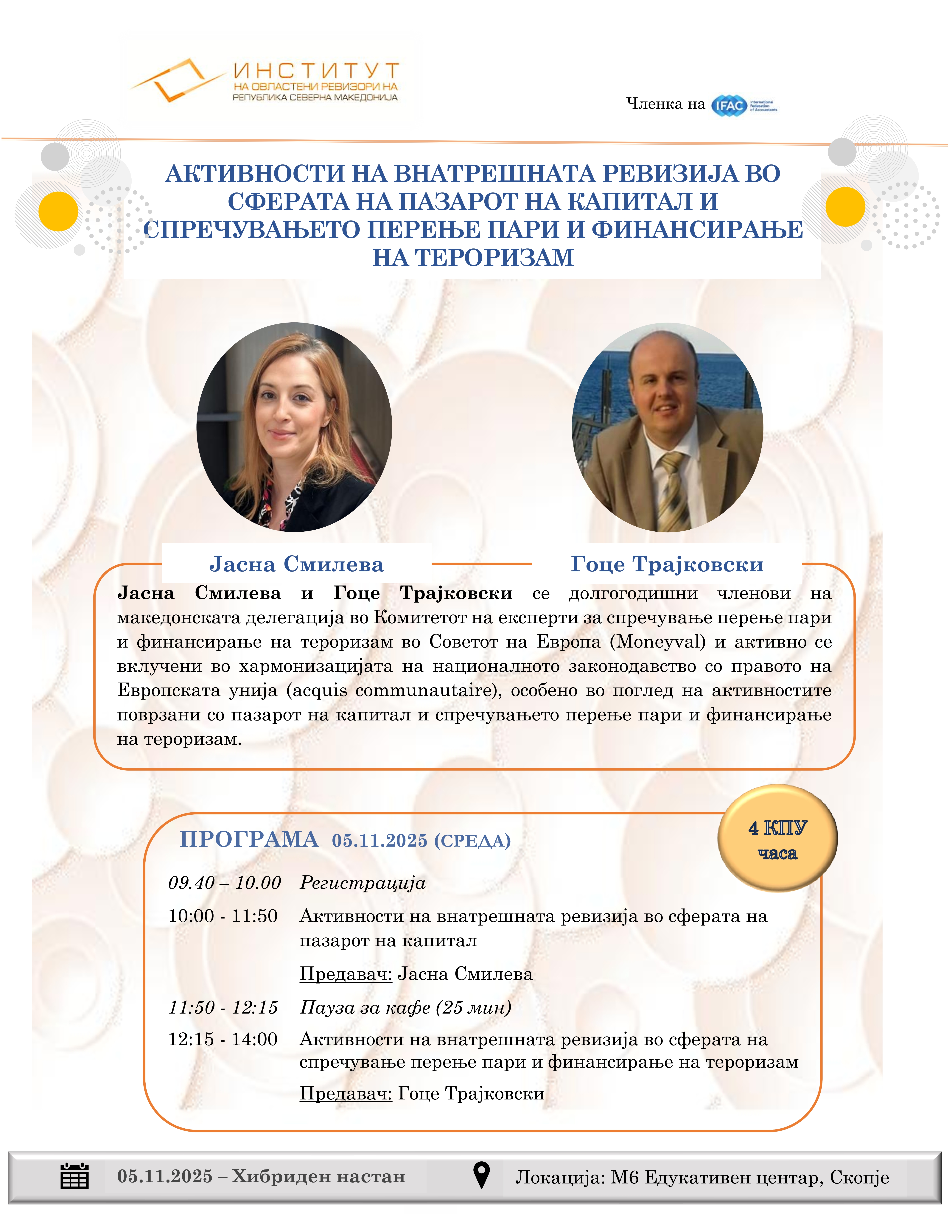 КПУ настан – 05 ноември 2025 година (среда), од 10 до 14 часот, 4 КПУ часа. Надоместокот за присуство на настанот е 1.500,00 денари за едно лице.
